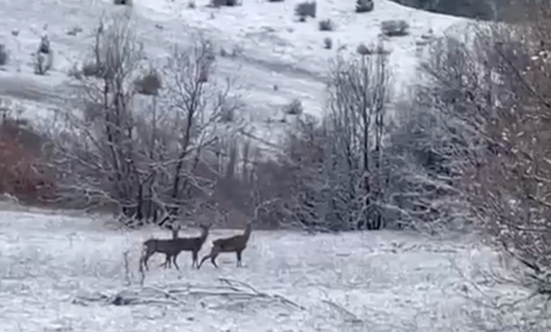 Erzincan’ın Refahiye ilçesi Baştosun köyünde ailesi ile hayvancılıkla uğraşan ve boş zamanlarında da sanal medyada içerik üretmek için doğayı görüntüleyen Berfin Karataş’ın objektifine bu sefer Kızıl geyikler takıldı. Kar yağışı altında doğada beslenen üç kızıl geyik, Karataş’ın cep telefonu kamerasıyla kayıt altına alındı. Doğada bir süre beslenen Kızıl geyikler daha sonra gözden kayboldu.